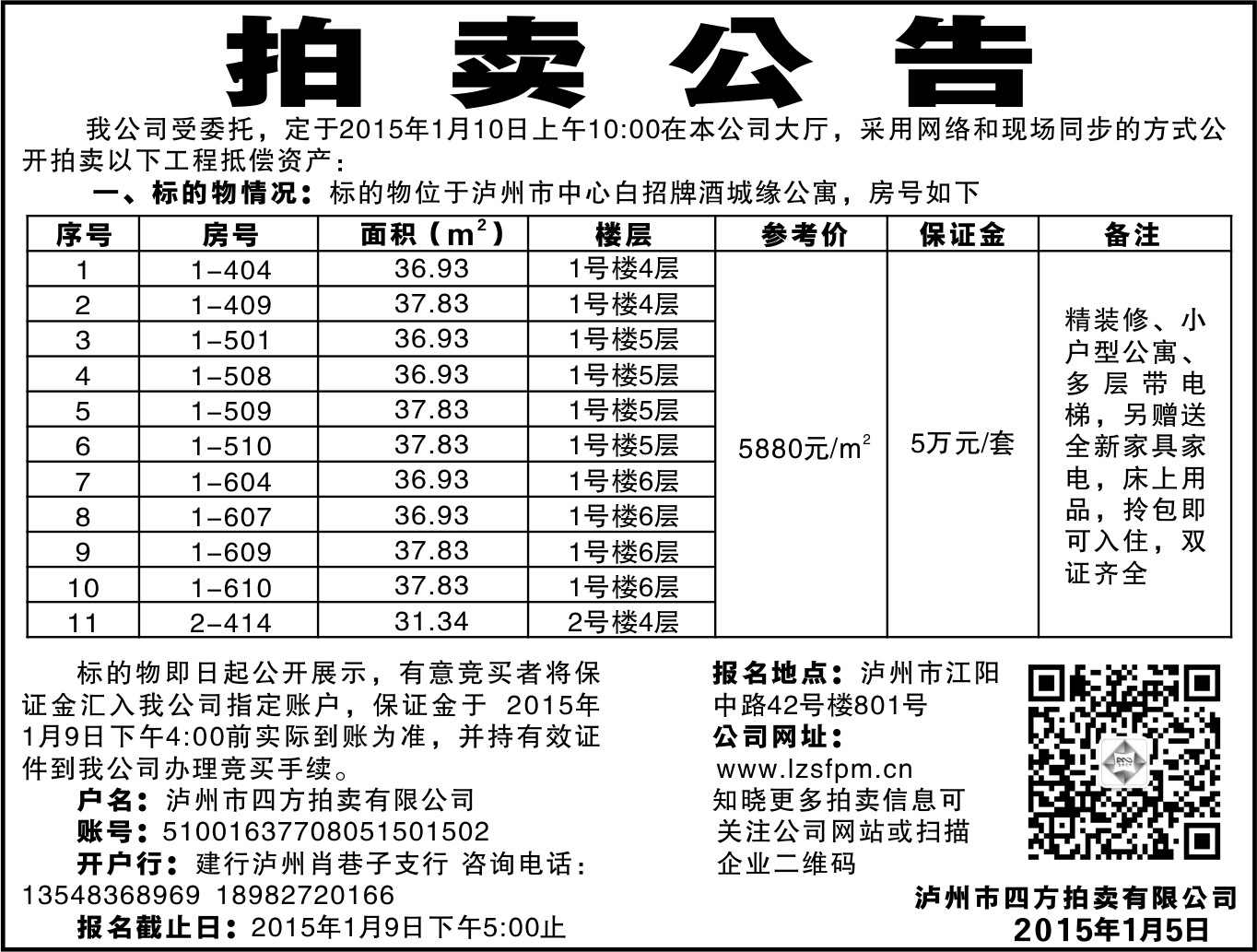 當(dāng)前位置:網(wǎng)站首頁(yè) > 新聞資訊 > 公司動(dòng)態(tài)2015年1月10日拍賣(mài)公告